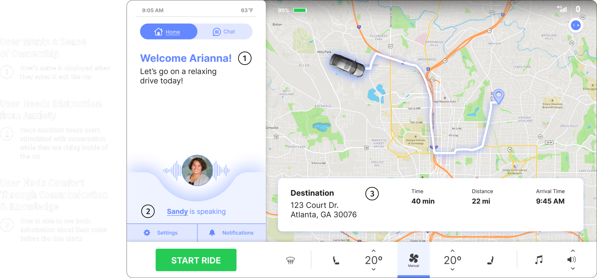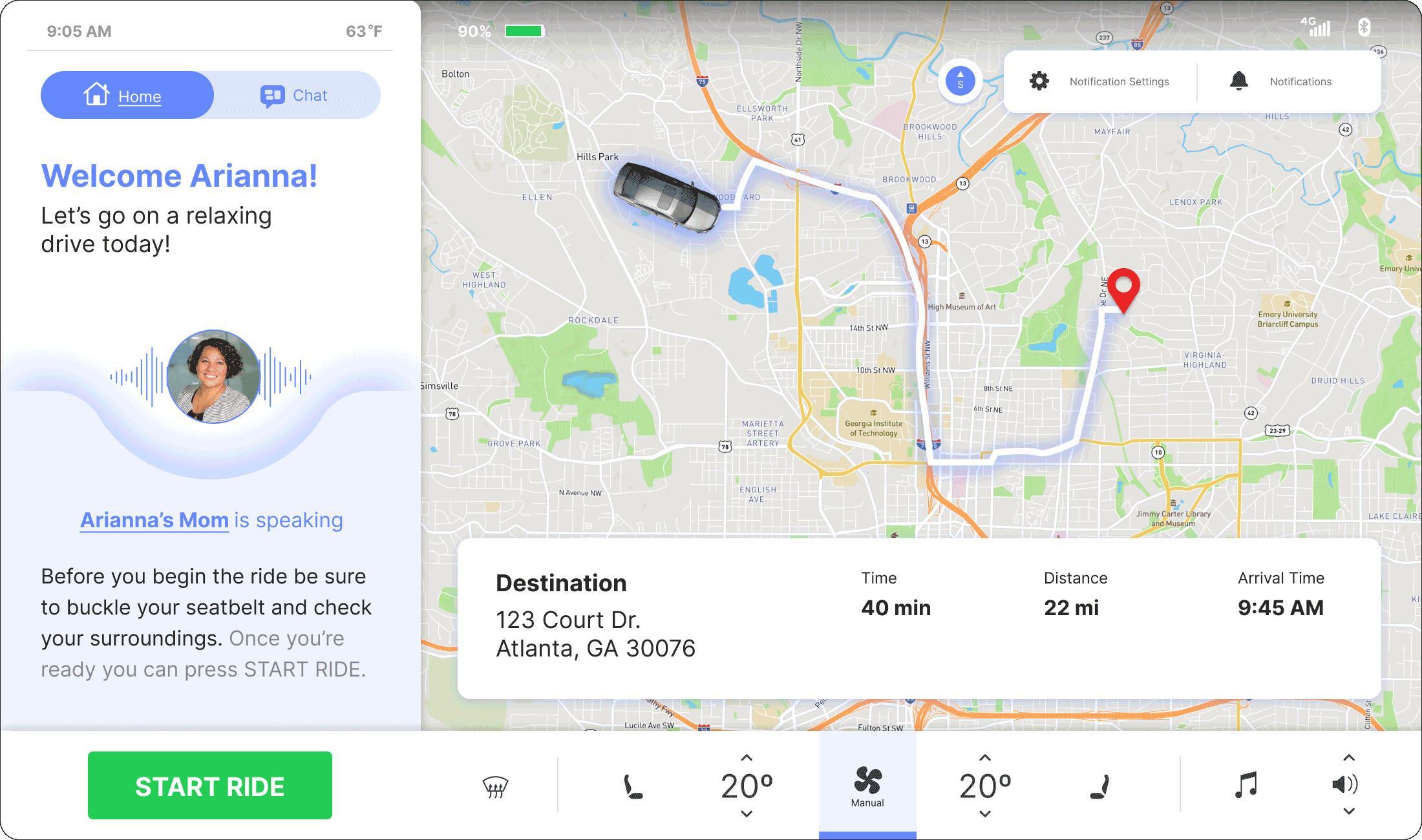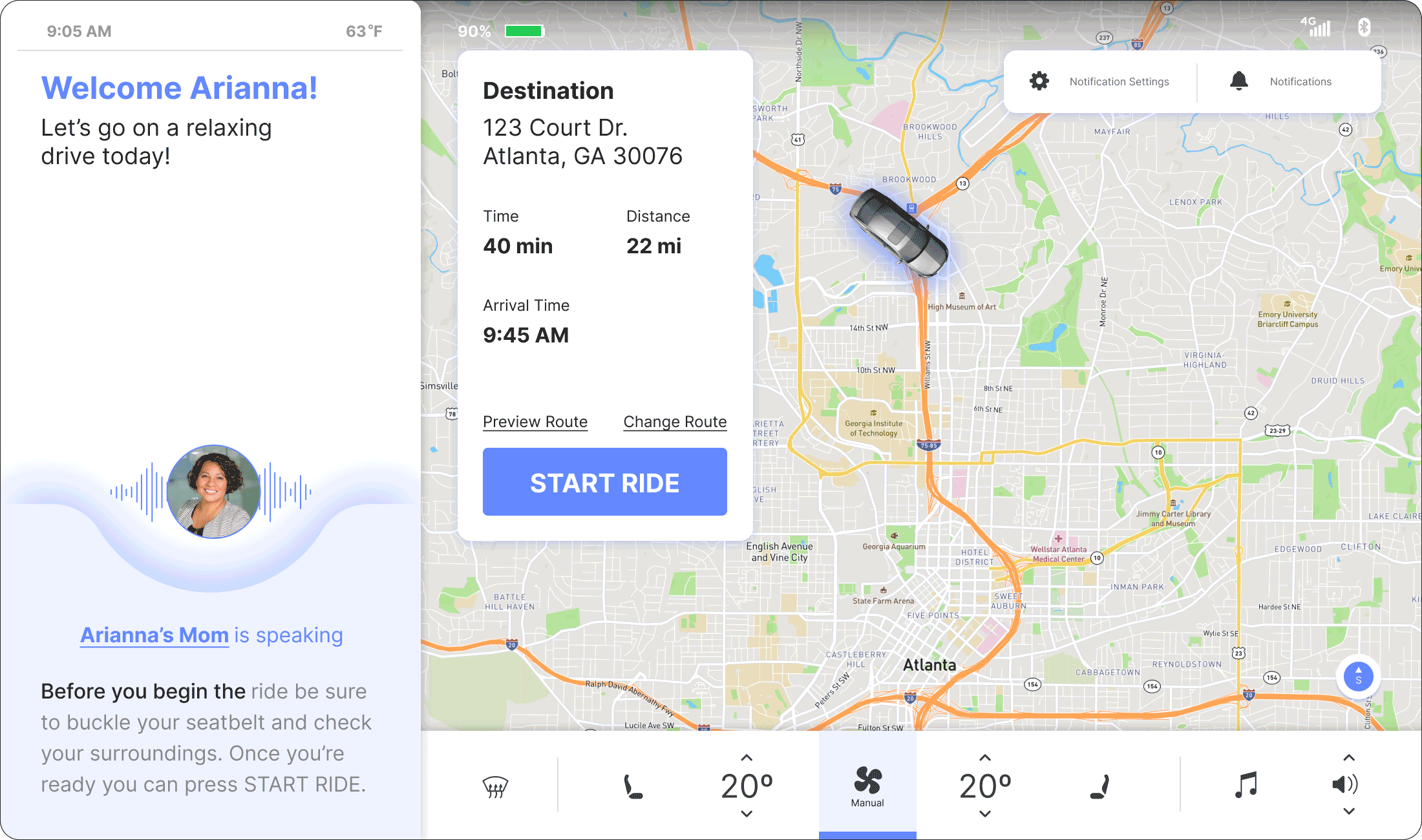After we met with our users and stakeholders for the concept testing, we used their feedback to wireframe a car dashboard interface with a communication assistant and customizable notification feature.